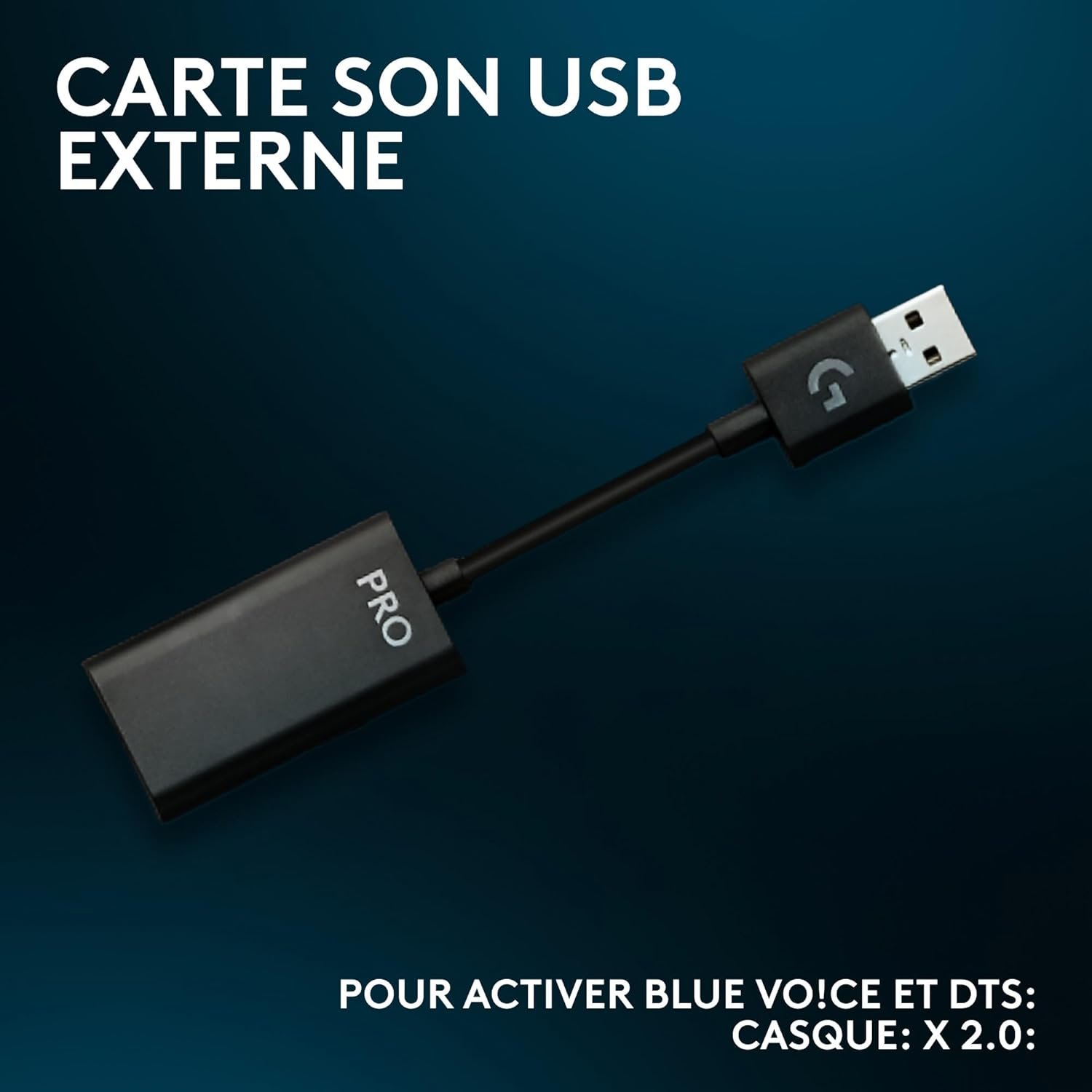 * Nécessite une carte son externe USB (DAC USB), un PC Windows et le logiciel Logitech G HUB.